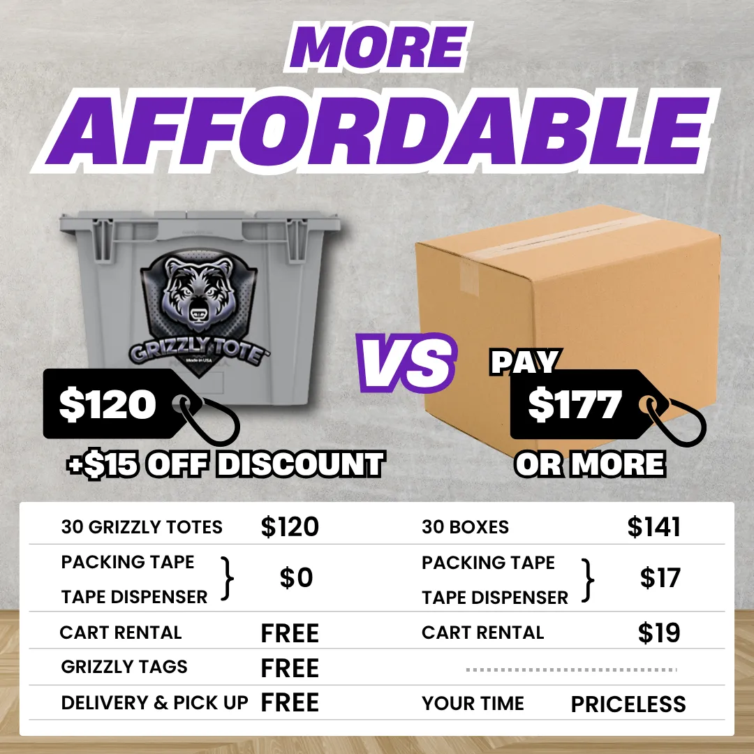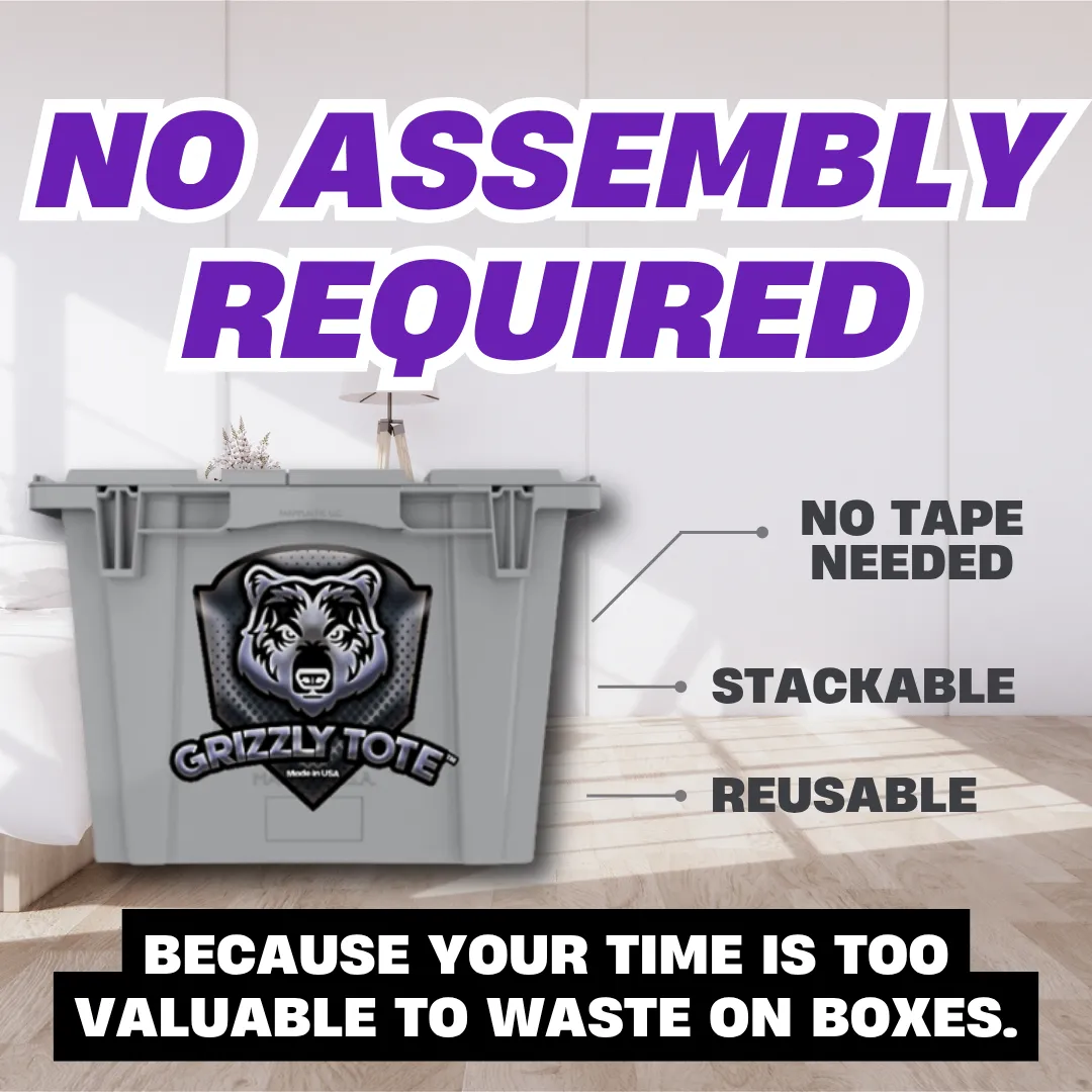 Made in the USA, our totes are waterproof, heavy-duty, and built to last. Unlike cardboard, they won’t tear, collapse, or fall apart—perfect for heavy items and multiple trips. Grizzly totes are great for bad-weather moving.